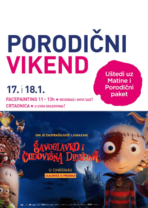 17. i 18. januara 2026., u terminu od 11.00 do 16.59, Porodični vikend stiže u Concept Cinema u Beogradu i CineStar bioskope u Novom Sadu, Pančevu i Zrenjaninu, uz najnoviji animirani film „Šavoglavko i čudovišna družina“ — toplu, duhovitu varijaciju na Frankenštajn temu, u kojoj se “čudovišta” ne boje smeha, a avantura ima dovoljno srca i za mlađe i za one malo starije.