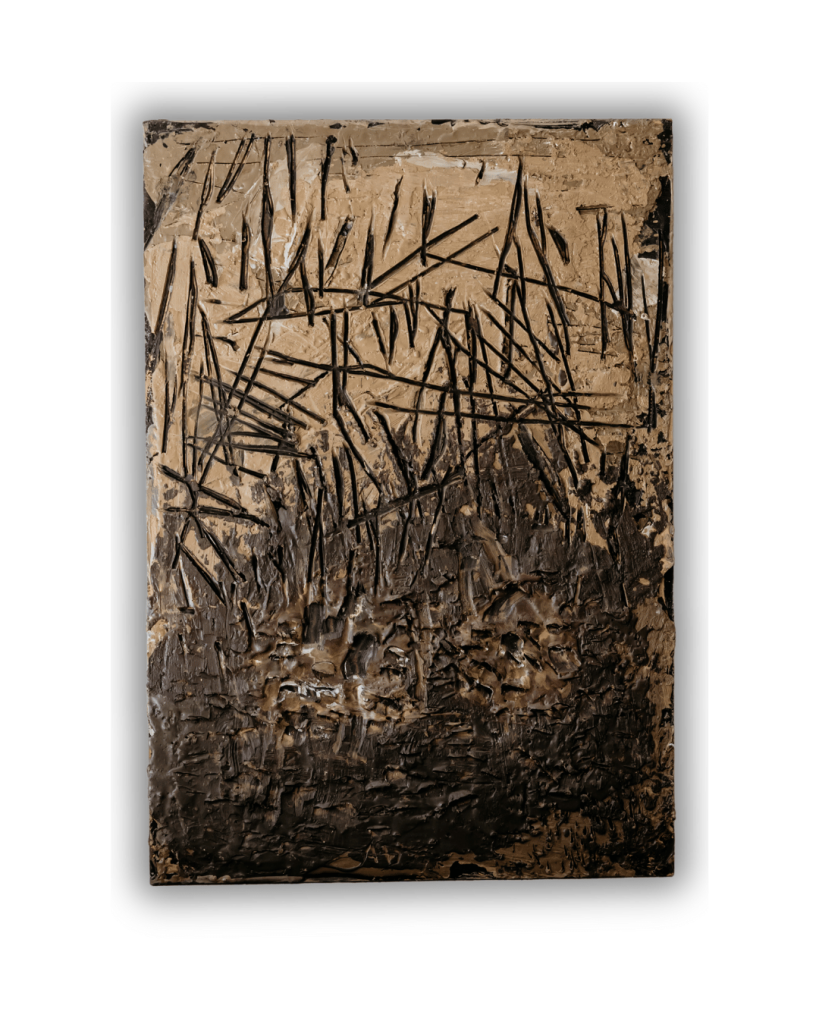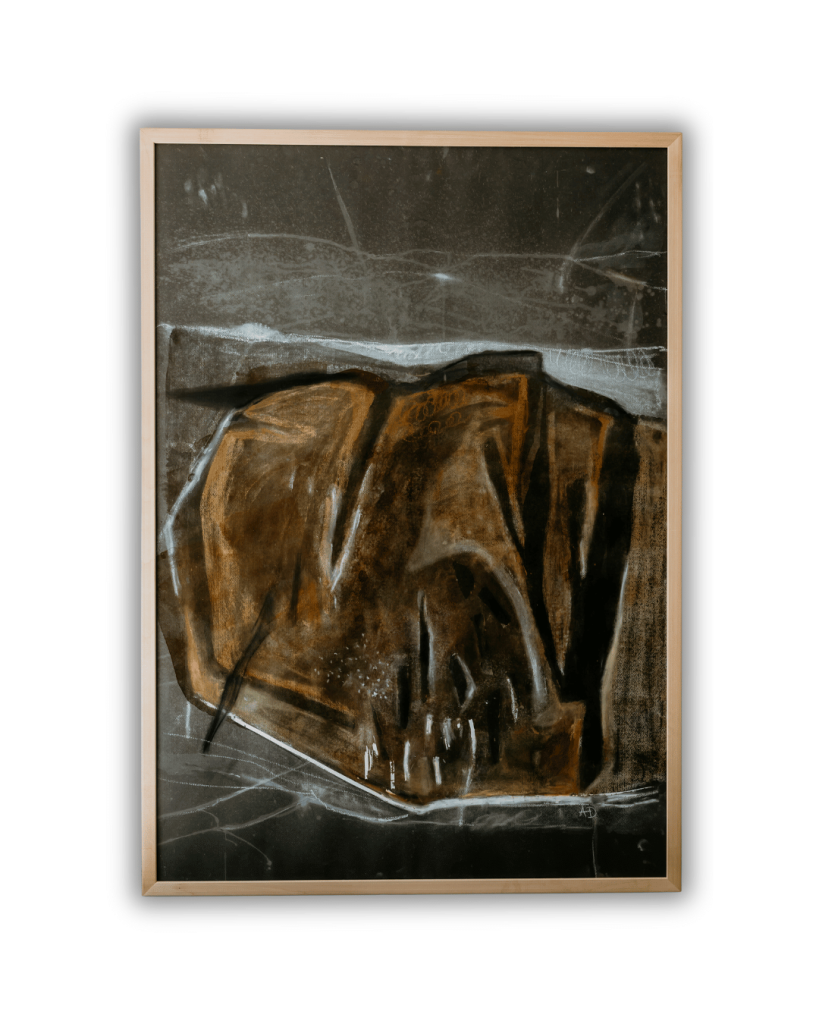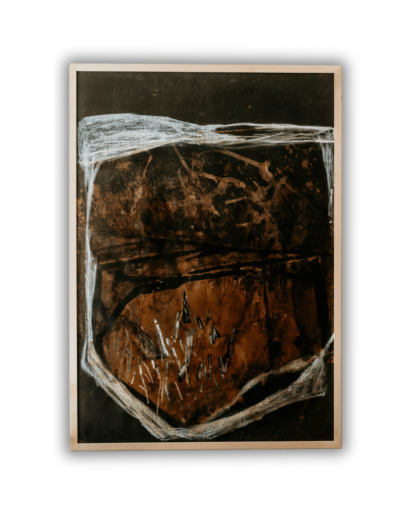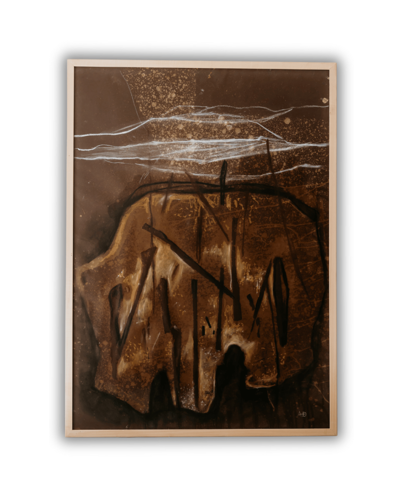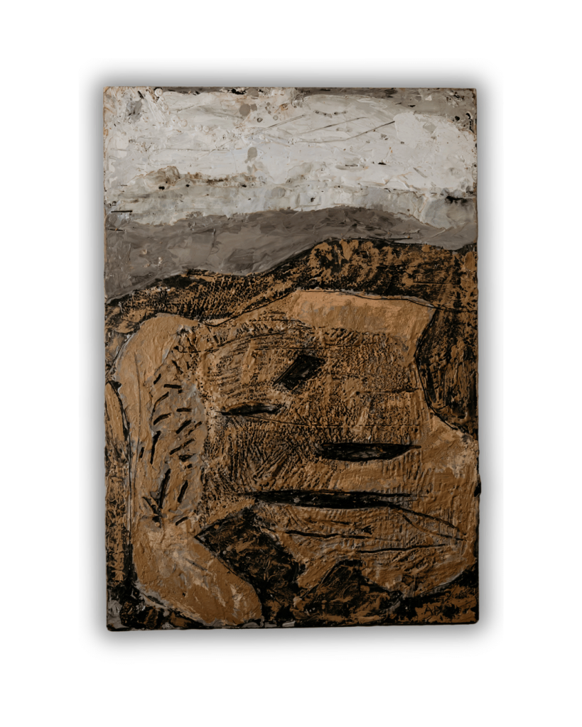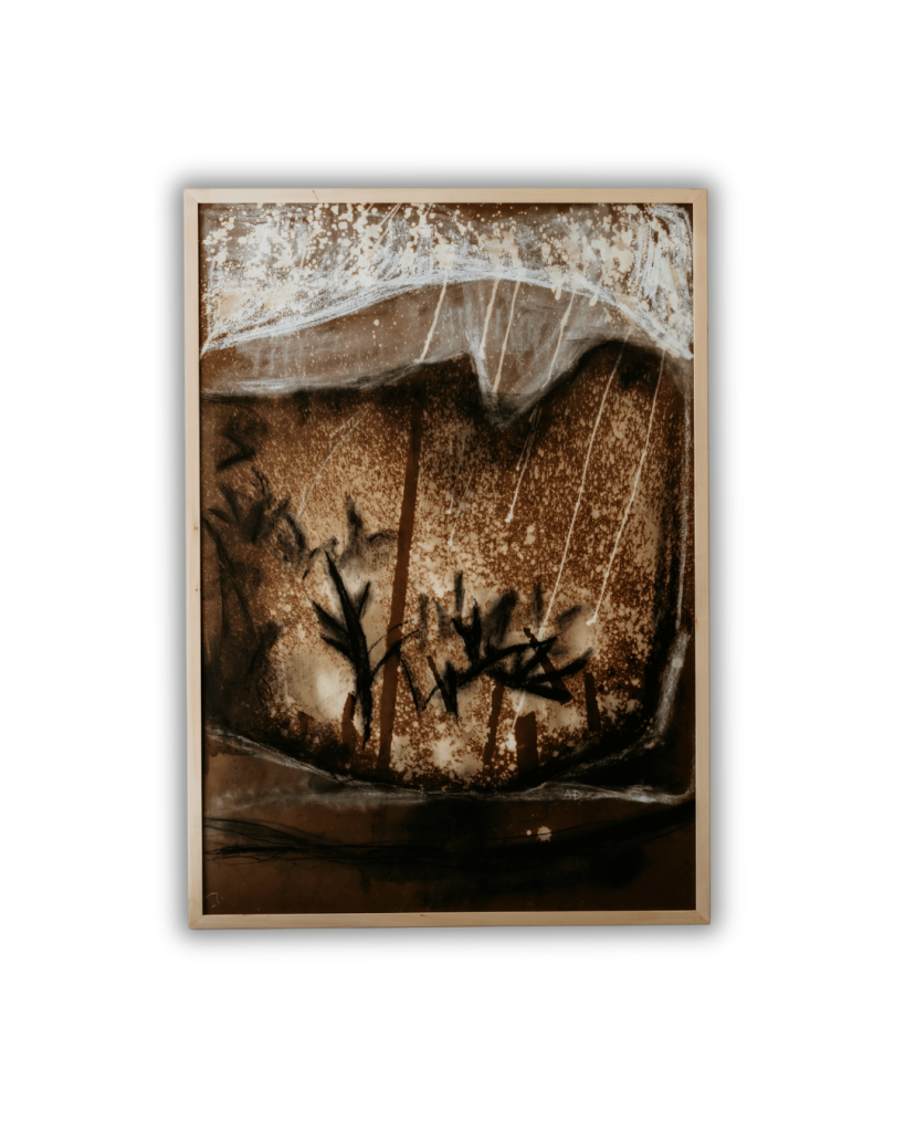 „TLO“ je tačka oslonca i polazište pogleda: krupni kadrovi zemlje u okerima, umbrama i grafitnim tišinama pretvaraju površinu planete u kožu sećanja. Ana Đapović spušta horizont, približava nas teksturi – voskom, ugljenom i pastelom gradi široka polja i vrednosne linije koje dišu između brazde i svetla. Na zemlji sve nastaje i počiva; ovde se plodnost ne prikazuje, već se događa pred očima: sloj po sloj, trag po trag, materija postaje slika početka. „TLO“ nas poziva da zastanemo, dlanom dotaknemo pod i oslušnemo tihi šum iz koga se rađa život.