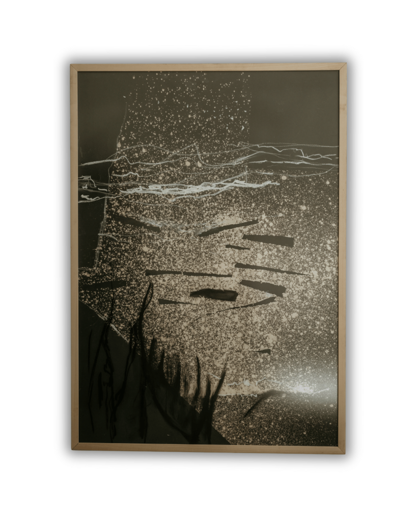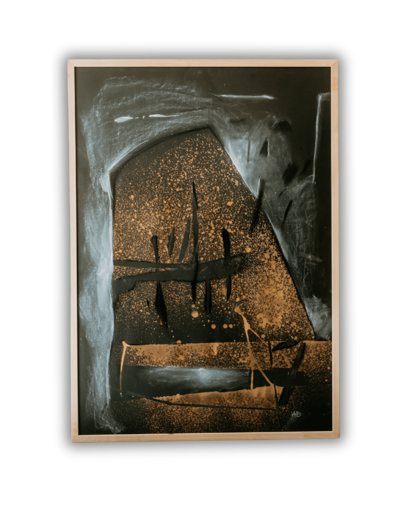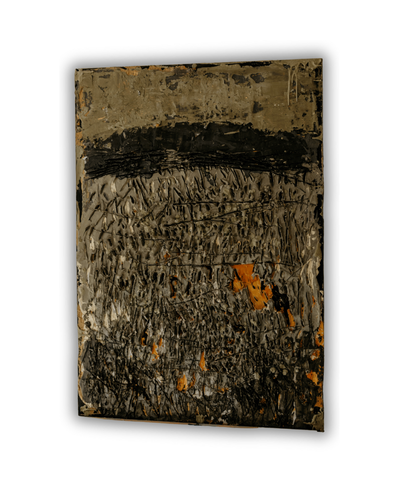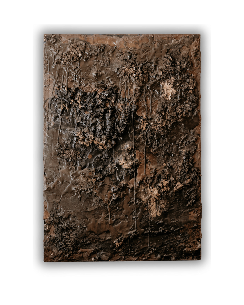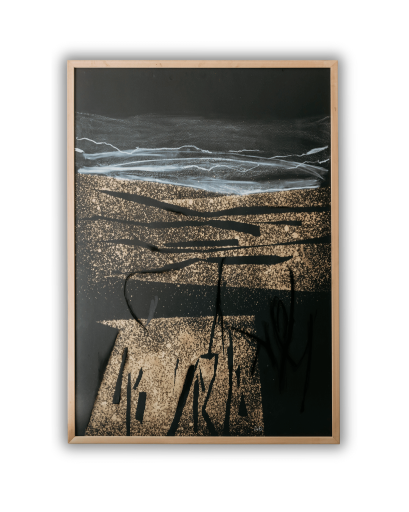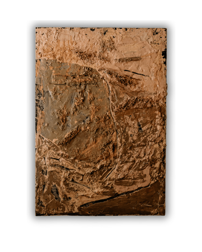 „TLO“ je tačka oslonca i polazište pogleda: krupni kadrovi zemlje u okerima, umbrama i grafitnim tišinama pretvaraju površinu planete u kožu sećanja. Ana Đapović spušta horizont, približava nas teksturi – voskom, ugljenom i pastelom gradi široka polja i vrednosne linije koje dišu između brazde i svetla. Na zemlji sve nastaje i počiva; ovde se plodnost ne prikazuje, već se događa pred očima: sloj po sloj, trag po trag, materija postaje slika početka. „TLO“ nas poziva da zastanemo, dlanom dotaknemo pod i oslušnemo tihi šum iz koga se rađa život.